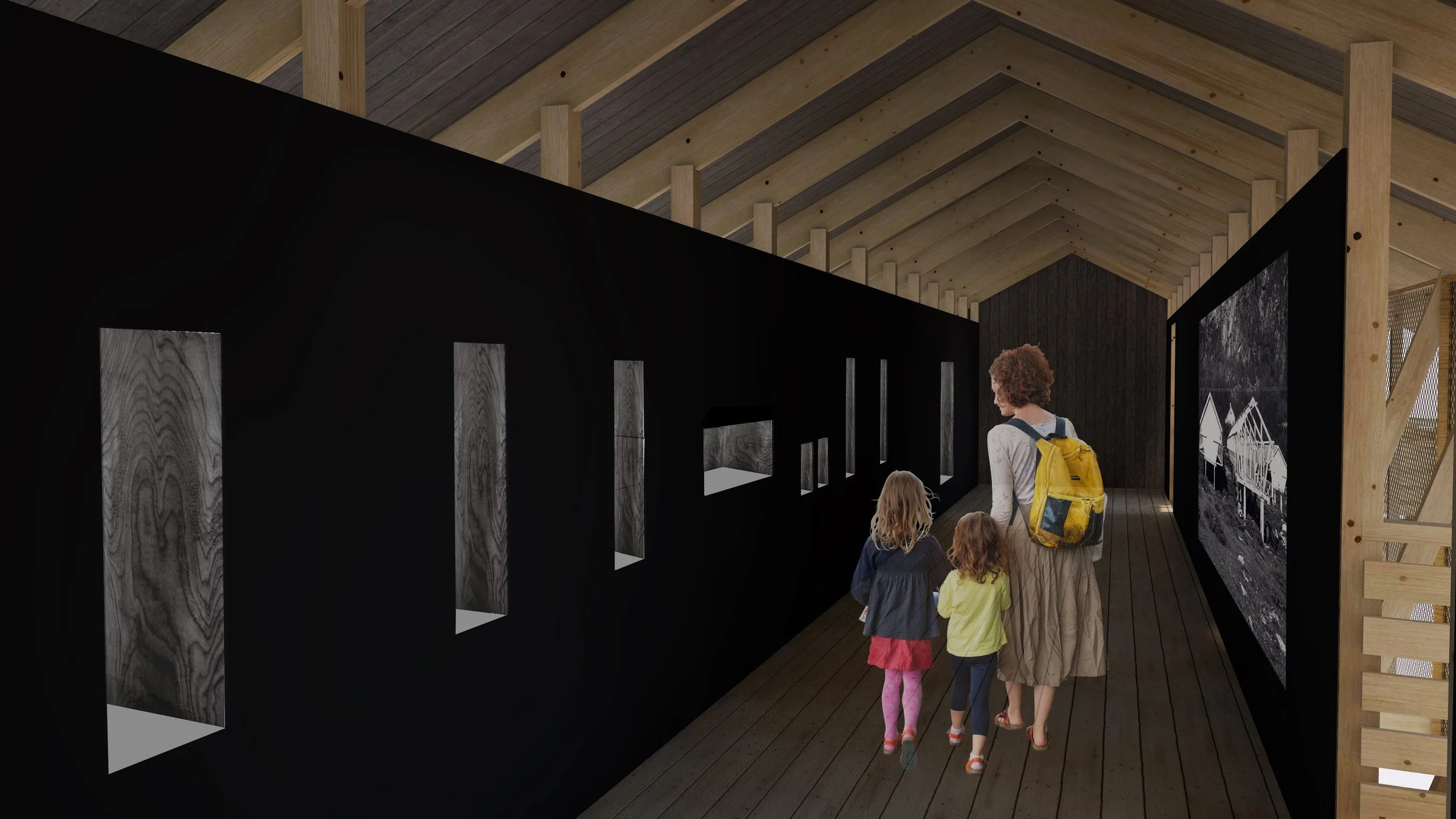 Den arkitektoniske strukturen refererer til de lettreisede revegårdene som historisk har preget regionen: en smal midtgang, konstruksjoner hevet over terrenget og en lett ramme av treverk. Disse karakteristiske grepene er gjenskapt og transformert til romlige elementer som leder besøkeren gjennom historien, materialene og tematikken. De tidligere burseksjonene er tolket som separate soner for kunst, objekter og installasjoner, som gradvis åpner for nye perspektiver.